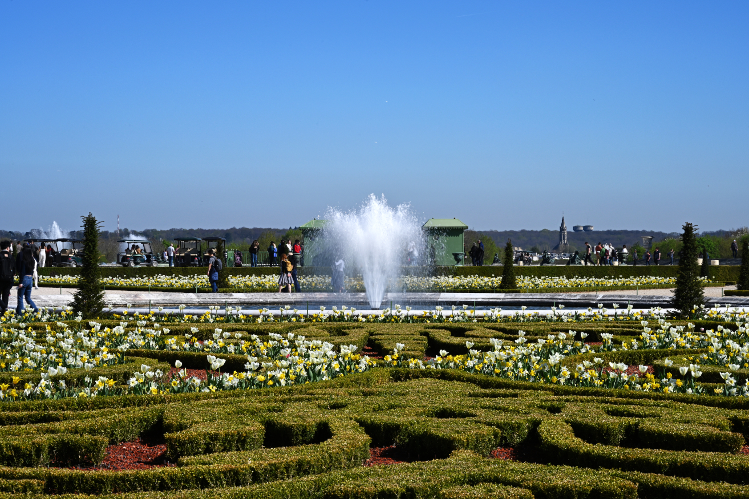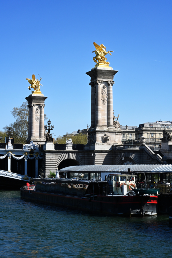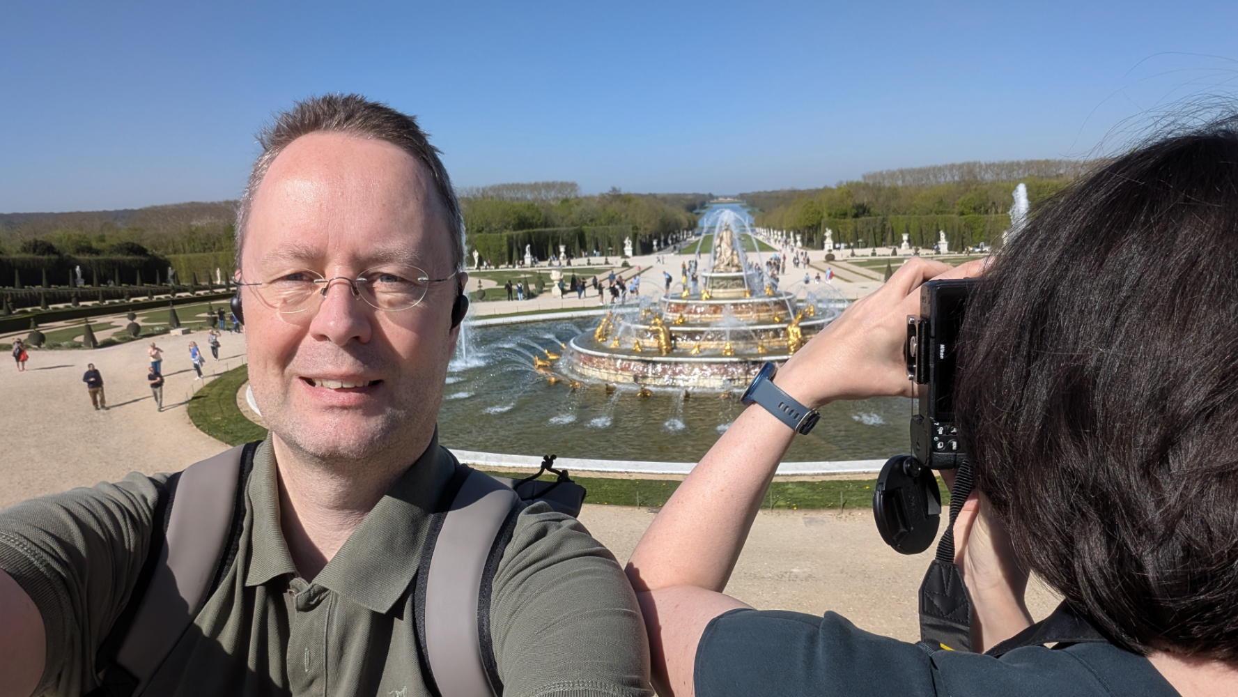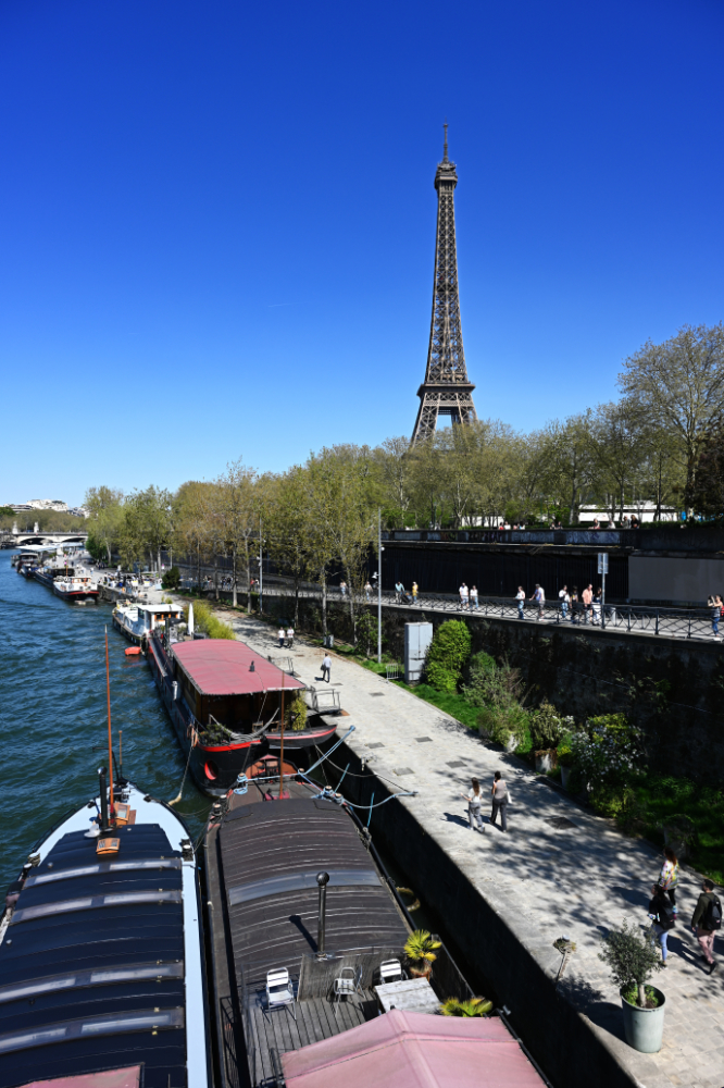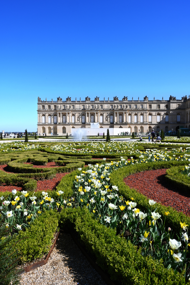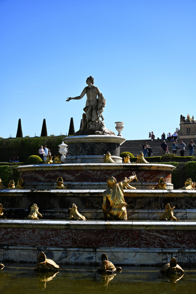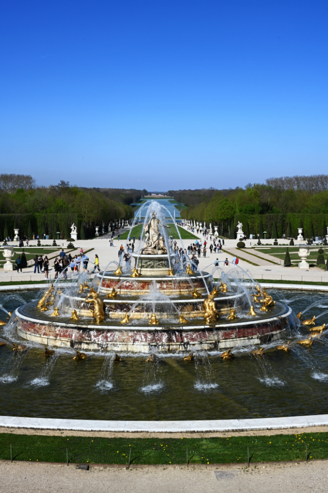 Am nächsten Morgen gab es ein französisches Frühstück und danach machten wir uns auf den Weg zum Schloss Versailles. Wir hatten unsere Tickets im Voraus gebucht, aber viele, viele andere Touristen hatten die gleiche Idee. Es war also extrem viel los und man wurde quasi durch die Ausstellungsräume geschoben. Das fand ich nicht ganz so prickelnd. Die Ausstellungsräume im unteren Geschoss haben allerdings viele ausgelassen, weil sie gleich in den Park gegangen sind. Dort war es dann wesentlich angenehmer. Danach sind auch wir in die Gartenanlage mit den Springbrunnen, wo sich die Menschenmassen dann relativ gut verlaufen haben. Wir hatten strahlend blauen Himmel und es war für Anfang April schon ziemlich warm. Was wir leider nicht wussten, war, dass die Brunnen nicht ständig in Betrieb sind. Und so standen wir dann bald vor ausgeschalteten Brunnen. Aber es war dann eh schon Zeit für das Mittagessen, für das wir uns einen Tisch in einer nahegelegenen Pizzeria reserviert hatten. Danach hatten wir Tickets für eine Bootsfahrt auf der Seine mit Waffelverkostung gebucht. Vorher haben wir aber noch von der Pont de Bir Hakeim aus Fotos vom Eiffelturm gemacht.