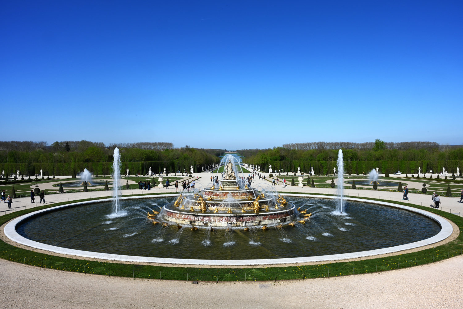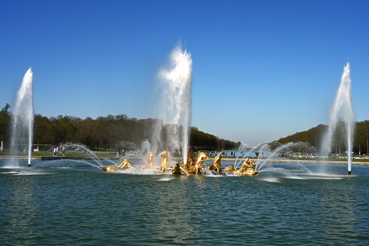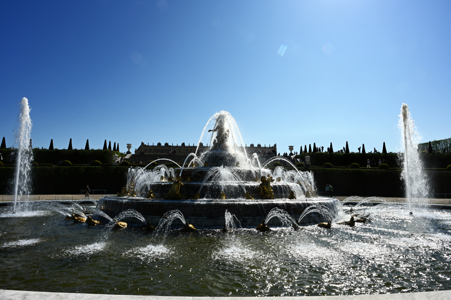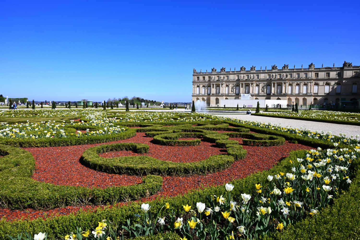 Am nächsten Morgen gab es ein französisches Frühstück und danach machten wir uns auf den Weg zum Schloss Versailles. Wir hatten unsere Tickets im Voraus gebucht, aber viele, viele andere Touristen hatten die gleiche Idee. Es war also extrem viel los und man wurde quasi durch die Ausstellungsräume geschoben. Das fand ich nicht ganz so prickelnd. Die Ausstellungsräume im unteren Geschoss haben allerdings viele ausgelassen, weil sie gleich in den Park gegangen sind. Dort war es dann wesentlich angenehmer. Danach sind auch wir in die Gartenanlage mit den Springbrunnen, wo sich die Menschenmassen dann relativ gut verlaufen haben. Wir hatten strahlend blauen Himmel und es war für Anfang April schon ziemlich warm. Was wir leider nicht wussten, war, dass die Brunnen nicht ständig in Betrieb sind. Und so standen wir dann bald vor ausgeschalteten Brunnen. Aber es war dann eh schon Zeit für das Mittagessen, für das wir uns einen Tisch in einer nahegelegenen Pizzeria reserviert hatten. Danach hatten wir Tickets für eine Bootsfahrt auf der Seine mit Waffelverkostung gebucht. Vorher haben wir aber noch von der Pont de Bir Hakeim aus Fotos vom Eiffelturm gemacht.