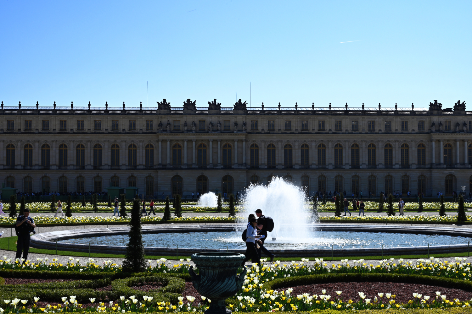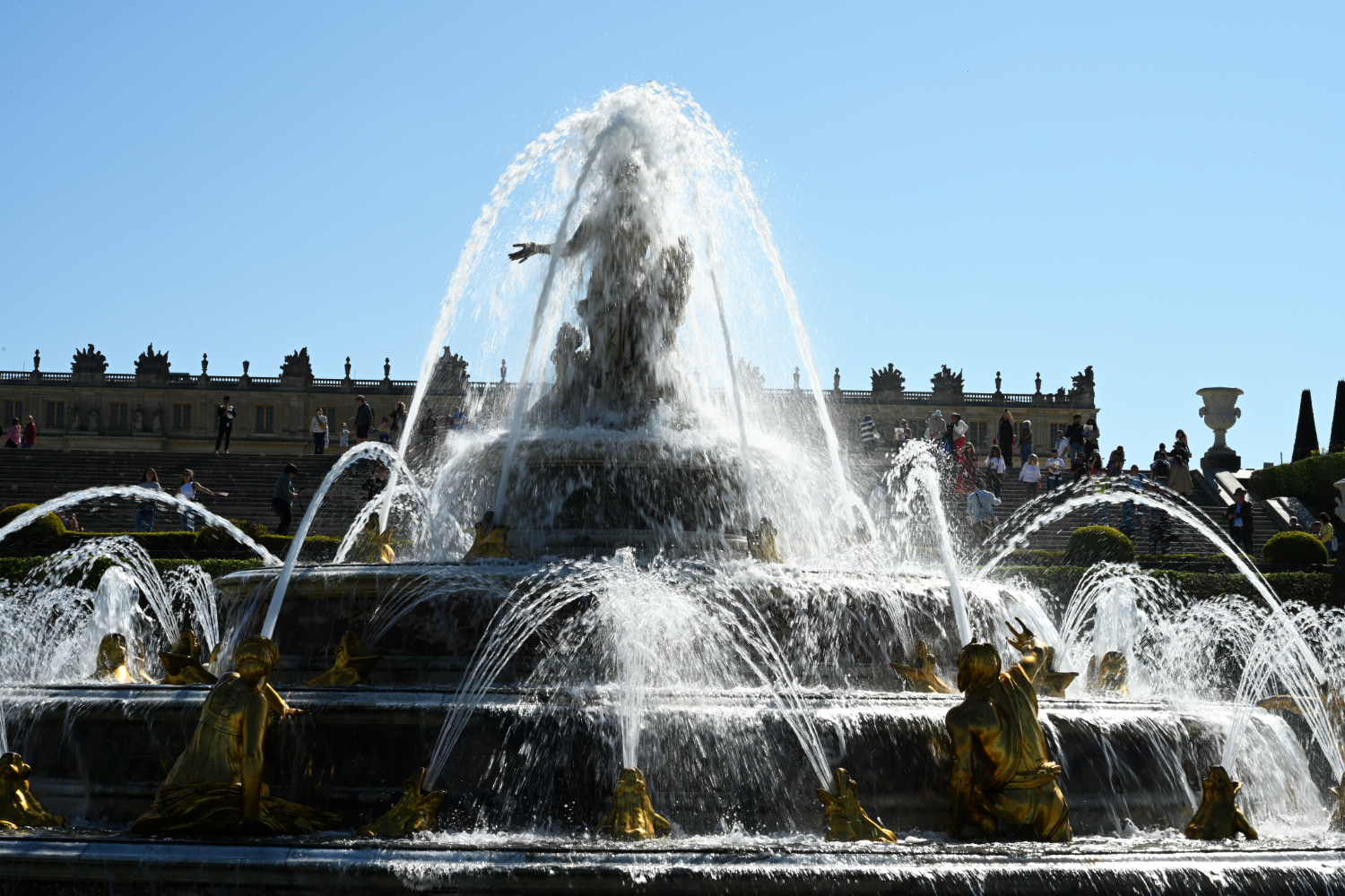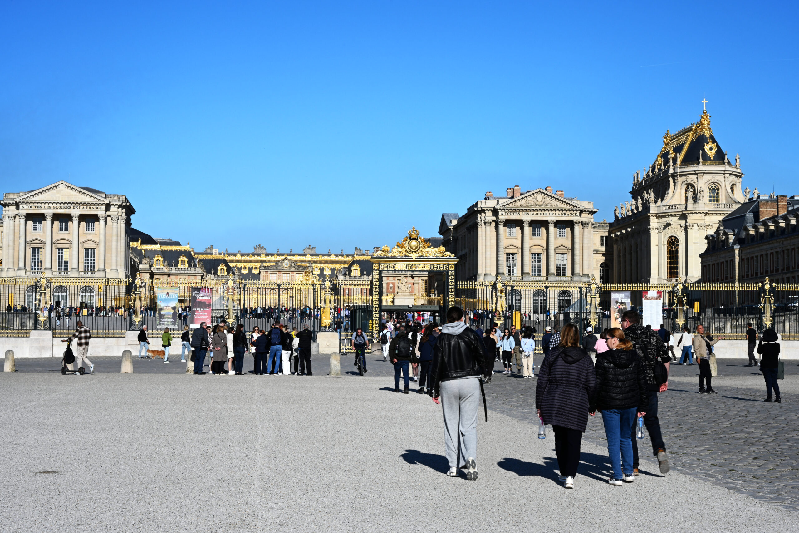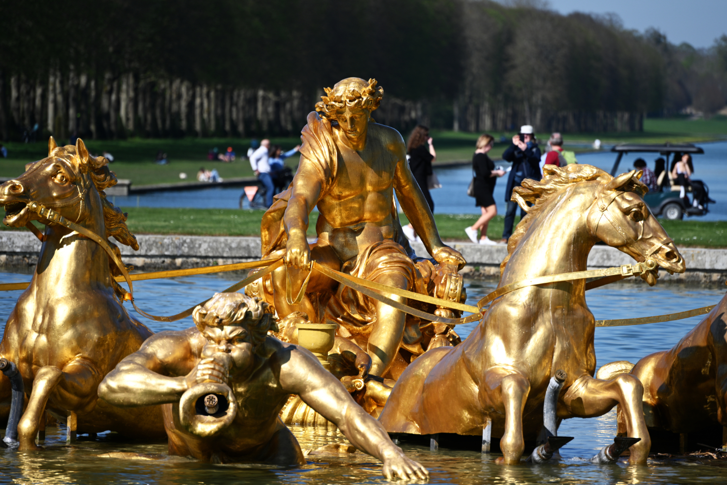 Am nächsten Morgen gab es ein französisches Frühstück und danach machten wir uns auf den Weg zum Schloss Versailles. Wir hatten unsere Tickets im Voraus gebucht, aber viele, viele andere Touristen hatten die gleiche Idee. Es war also extrem viel los und man wurde quasi durch die Ausstellungsräume geschoben. Das fand ich nicht ganz so prickelnd. Die Ausstellungsräume im unteren Geschoss haben allerdings viele ausgelassen, weil sie gleich in den Park gegangen sind. Dort war es dann wesentlich angenehmer. Danach sind auch wir in die Gartenanlage mit den Springbrunnen, wo sich die Menschenmassen dann relativ gut verlaufen haben. Wir hatten strahlend blauen Himmel und es war für Anfang April schon ziemlich warm. Was wir leider nicht wussten, war, dass die Brunnen nicht ständig in Betrieb sind. Und so standen wir dann bald vor ausgeschalteten Brunnen. Aber es war dann eh schon Zeit für das Mittagessen, für das wir uns einen Tisch in einer nahegelegenen Pizzeria reserviert hatten. Danach hatten wir Tickets für eine Bootsfahrt auf der Seine mit Waffelverkostung gebucht. Vorher haben wir aber noch von der Pont de Bir Hakeim aus Fotos vom Eiffelturm gemacht.