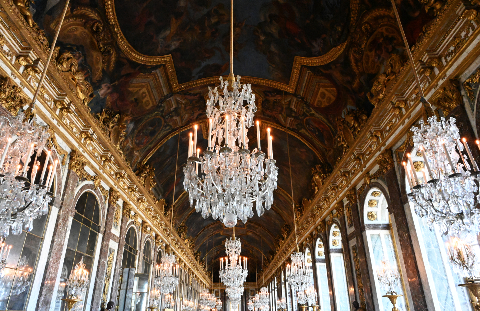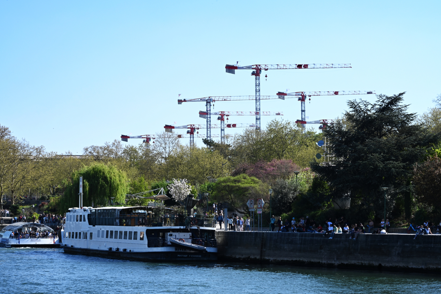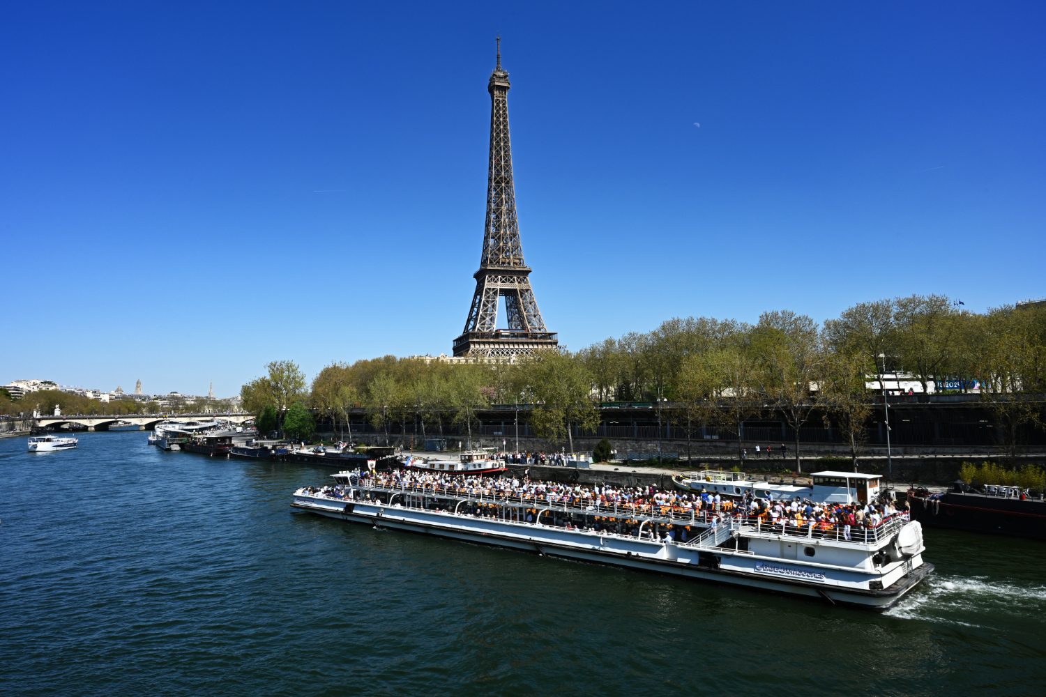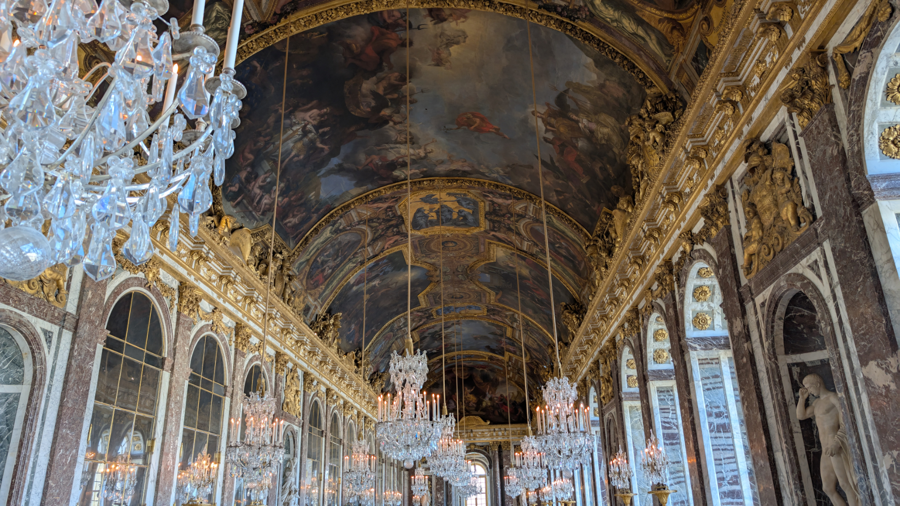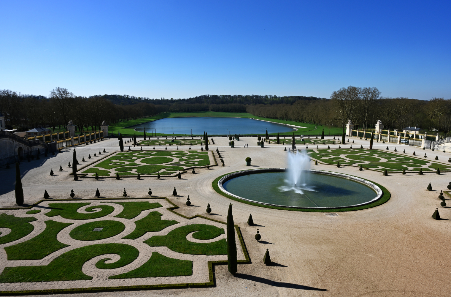 Am nächsten Morgen gab es ein französisches Frühstück und danach machten wir uns auf den Weg zum Schloss Versailles. Wir hatten unsere Tickets im Voraus gebucht, aber viele, viele andere Touristen hatten die gleiche Idee. Es war also extrem viel los und man wurde quasi durch die Ausstellungsräume geschoben. Das fand ich nicht ganz so prickelnd. Die Ausstellungsräume im unteren Geschoss haben allerdings viele ausgelassen, weil sie gleich in den Park gegangen sind. Dort war es dann wesentlich angenehmer. Danach sind auch wir in die Gartenanlage mit den Springbrunnen, wo sich die Menschenmassen dann relativ gut verlaufen haben. Wir hatten strahlend blauen Himmel und es war für Anfang April schon ziemlich warm. Was wir leider nicht wussten, war, dass die Brunnen nicht ständig in Betrieb sind. Und so standen wir dann bald vor ausgeschalteten Brunnen. Aber es war dann eh schon Zeit für das Mittagessen, für das wir uns einen Tisch in einer nahegelegenen Pizzeria reserviert hatten. Danach hatten wir Tickets für eine Bootsfahrt auf der Seine mit Waffelverkostung gebucht. Vorher haben wir aber noch von der Pont de Bir Hakeim aus Fotos vom Eiffelturm gemacht.